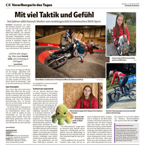 Mit Paikea Marte konnte das Bludenzer BMX-Sparkassenteam beim 6. Lauf zur Deutschschweizer Meisterschaft in Zetwil (SUI) einen Sieg herausfahren. Ihr am nächsten kam Feanor Marte, der in der Klasse Boys U16 im Finale den guten 5. Platz belegte. Lasse Vallazza (14., Boys U14) fuhr ins B-Finale, Johannes Egger (Boys U12) gewann das C-Finale. Ebenfalls im C-Finale fuhr Felix Peschl (21., Boys U14). Samuel Muther, Feenja Marte und Luk Leu platzierten sich jeweils im D-Finale. Alle Ergebnisse auf www.bmxracing.ch